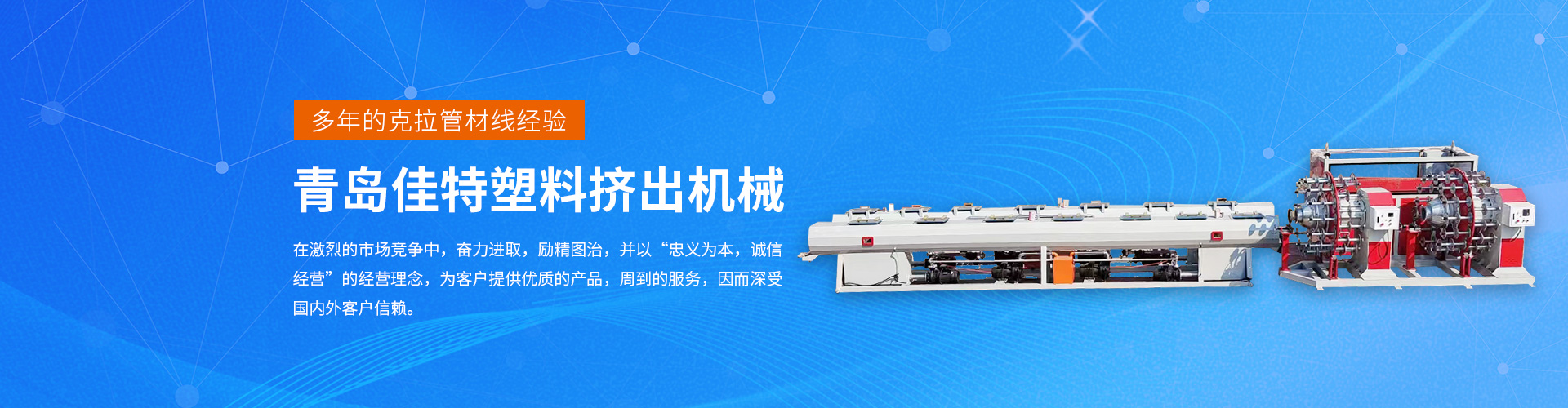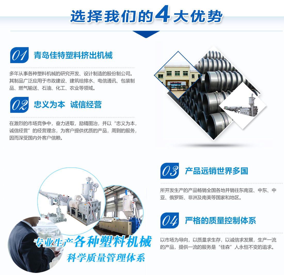 青島佳特塑料擠出機(jī)械有限公司是多年從事各種塑料機(jī)械的研究開(kāi)發(fā)、設(shè)計(jì)制造的股份制公司。公司主導(dǎo)產(chǎn)品:PP、PE鈣塑格子板生產(chǎn)線(xiàn),大口徑雙重壁纏繞管生產(chǎn)線(xiàn),U-PVC、C-PVC管材生產(chǎn)線(xiàn),PP、PE、PPR、PPB供水燃?xì)夤懿纳a(chǎn)線(xiàn)、硅芯管生產(chǎn)線(xiàn)、鋁塑、鋼塑、銅塑管、尼龍棒、尼龍管生產(chǎn)線(xiàn),PVC、PE、PP波紋管生產(chǎn)線(xiàn),單雙向土工格柵生產(chǎn)線(xiàn),木塑板材生產(chǎn)線(xiàn),PVC、PP、PE片材、板材生產(chǎn)線(xiàn),PET打包帶生產(chǎn)線(xiàn),其制品廣泛應(yīng)用于市政建設(shè)、建筑給排水、電信通訊、包裝制品、燃?xì)廨斔汀⑹汀⒒ぁ⑥r(nóng)業(yè)等領(lǐng)域。 [查看更多]